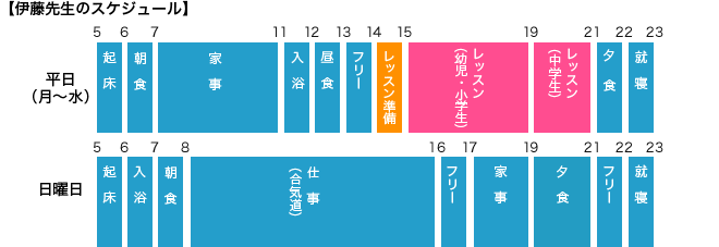 平日にレッスン、平日の後半から週末にかけて合気道の指導者をしています。ホームティーチャーとして英語に触れることは、合気道に来る外国人とのコミュニケーションだけでなく自分自身の成長にも役立っています。