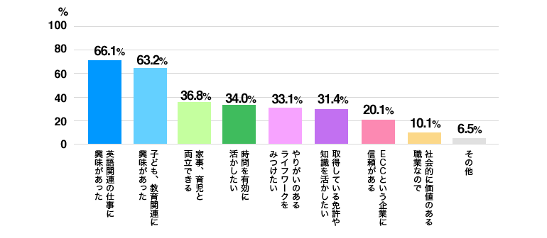 全体の6割~7割近くの方が「子ども・教育・英語への興味」をきっかけにホームティーチャーへの第一歩を踏み出しています。次いで、3割~4割以上の方が「やりがい」「家事・育児との両立」を挙げています。