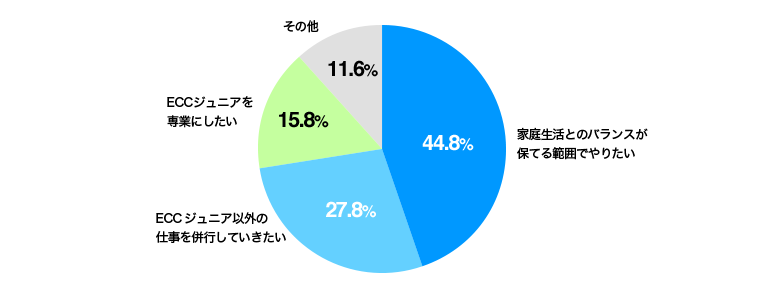 およそ半分の方が「家庭生活とのバランスが保てる範囲でやりたい」と回答しています。特に、30~40代・既婚者の方が多いようです。また「ECCジュニア以外の仕事を併行していきたい」方も3割近くいることから、ライフスタイルに合わせた働き方が求められていることがうかがえます。