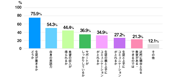 「生徒募集」「英語力」「収入」を挙げる方が多く、ほとんどの方が教室運営や英語指導の経験がないことにより不安を感じていることが分かります。説明会で詳しく聞きたいポイントとしても、「生徒募集」や「収入システム」を挙げる方が多いようです。